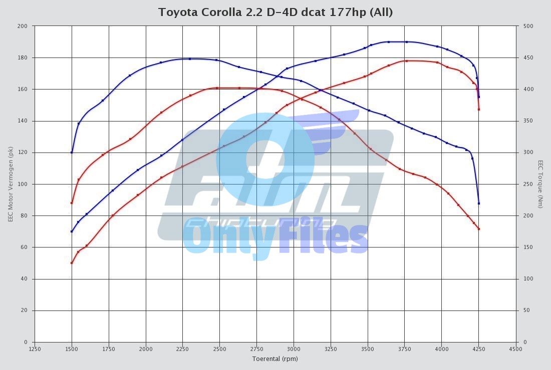 Only Files is leading in the development of Toyota Corolla 2.2 D-4D dcat 177hp tuning files. The development of each Toyota Corolla 2.2 D-4D dcat 177hp tuning file is the result of perfection and dedication by Only Files programmers. The organization only uses the latest technologies and has many years experience in ECU remapping software. Many (chiptuning) organizations around the globe download their tuning files for Toyota Corolla 2.2 D-4D dcat 177hp at Only Files for the best possible result. All Toyota Corolla 2.2 D-4D dcat 177hp tuning files deliver the best possible performance and results within the safety margins.